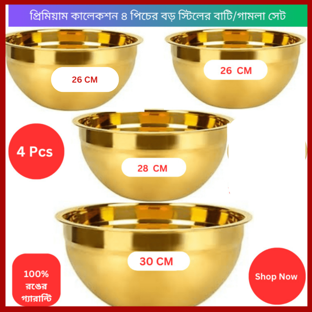 স্টিলের 4 পিসের প্রিমিয়াম গোল্ডেন কালার বড় বাটি/ গামলা সেট Original স্টিল ৩০,২৮,২৬ ,২৬ CM